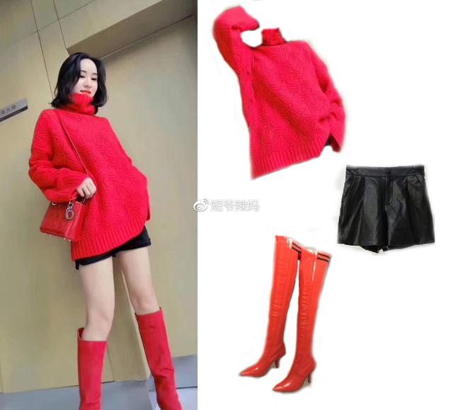 ▼红色长款毛衣+皮短裤+红色长靴,红红火火的穿搭,非常适合圣诞过年哦~而且亮红色真的很显白,基本不挑肤色!