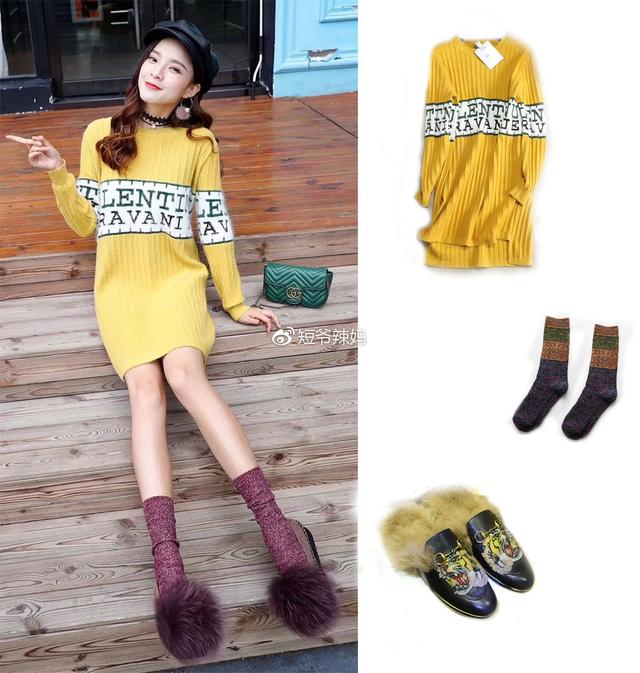 ▼黄色字母长款毛衣+短裤(见图一)+堆堆袜+刺绣毛拖,黄色字母毛衣会显得更加个性随性,闺蜜间逛街都是不错的选择,适当配个白色毛呢大衣,完美!