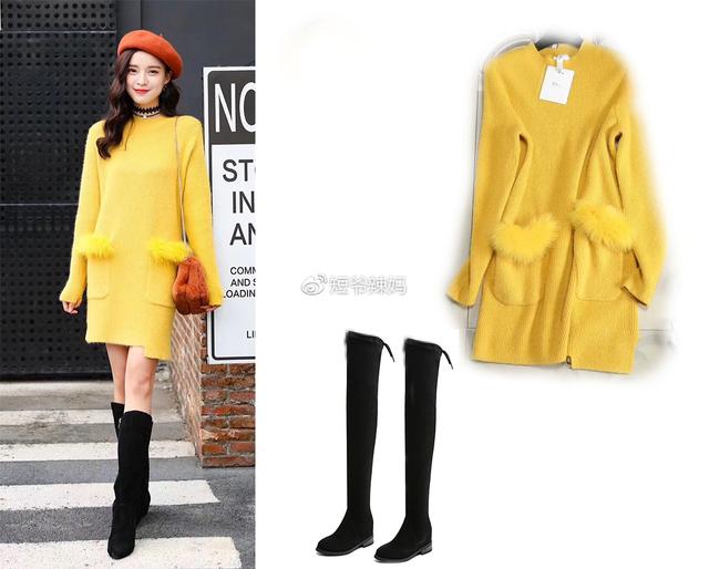 ▼柠檬黄长款毛衣+短裤(见图一)+长靴+贝雷帽,柠檬黄真的很个性,淑女范十足,而且很显白哦!长靴可配高跟长靴,也可以配矮跟长靴,非常显腿长!