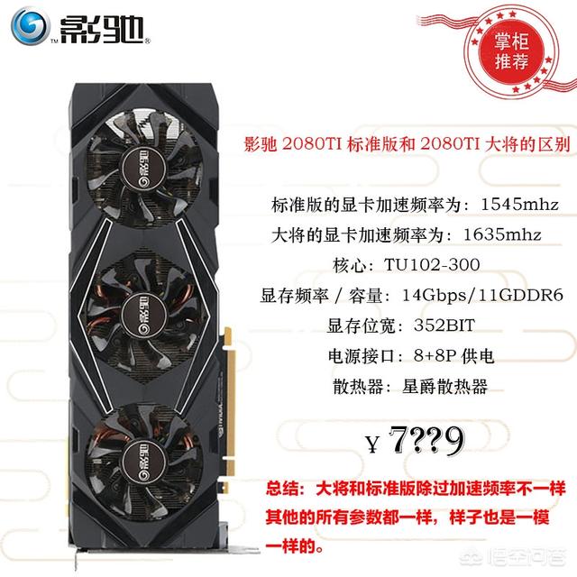 但要注意一下,还有一个影驰2080ti标准版,它的外观与影驰大将2080ti是一模一样的,但是加速频率不同。两者之间,价格相差200元。