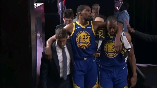 这场比赛的最大看点其实就是杜兰特终于复出了。自从5月9日在西部半决赛之中受伤之后,杜兰特已经缺席了一个多月之久,9场比赛了。虽然他的小腿伤势并没有痊愈,但是现在勇士队已经被逼到了悬崖边上,杜兰特再不复出这个赛季很有可能就结束了。