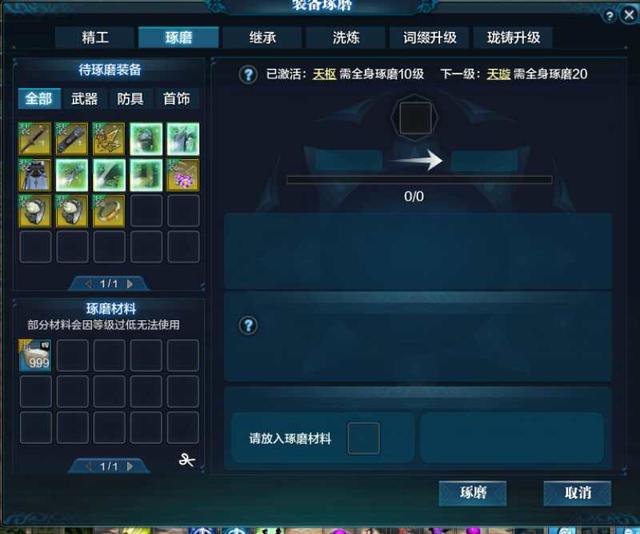 琢磨和精工消耗相同的材料,全装备琢磨等级达到10 20之后会有全属性点的奖励,同样消耗碎银很多,如果能在T3的时候达到全身10级的话,后期就可以把琢磨先放一放,有闲钱再点。