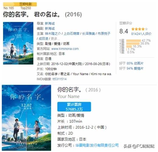 《你的名字》这部作品在2016年的时候上映,得到了很多网友的喜爱。这部电影在豆瓣上得到了8.4的高分,而且累积票房达到了5.7亿,非常的优秀。