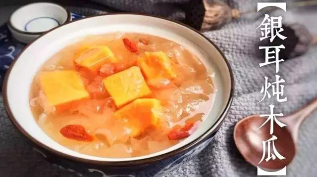【制法】将银耳用清水浸透发开,洗净;木瓜削皮去籽,切成小块;南北杏仁去衣,洗净,连同银耳、冰糖一起放入炖煲内,加适量开水炖煮20分钟后即可食用。