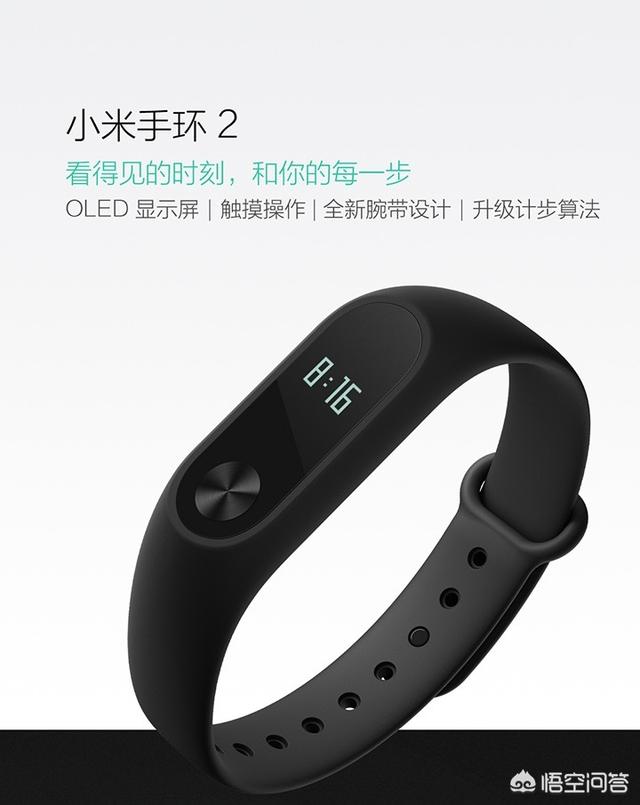 小米手环二代中加入了OLED 屏幕,增加了显示时间的功能,不过还是以计步、测心率为主。销量也很不错。