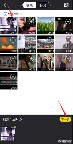 2、之后就会来到视频选择界面,你手机中的所有视频都可以在这里找到,将你要添加字幕的视频添加到下面的媒体栏中,然后点击下一步。