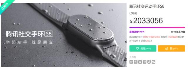 自腾讯S8手环21日在京东众筹上线,首日就突破了30万,达到了众筹目标,3天就突破了100万,如今更是10天破200万,现在众筹金额还在持续增长。