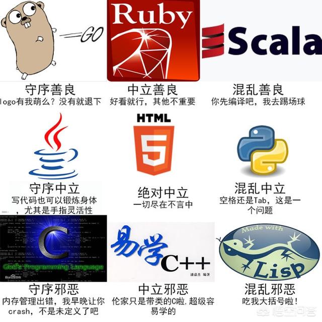 Java一般认为是守序中立,C++大约在混乱中立、中立邪恶到混乱邪恶这一带Python大概是混乱善良到混乱中立,而Lisp的评价呈两极分化状,从守序善良到混乱邪恶都出现过。Haskell的邪恶立场是没跑了,但不知道为什么所有人都认为Go是守序的?