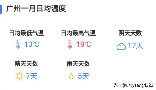 广州5-10月气温偏高,最冷的1月平均气温10-19℃;2月和12月气温是12-20℃;3月是16-23℃;4月和11月温度大约是20-25℃。0度的天气很少很少。