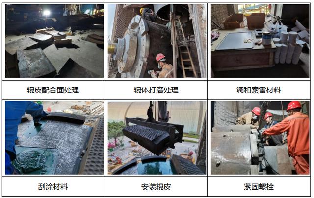 l 根据辊体表面的磨损尺寸,计算且调和索雷碳纳米聚合物材料并涂覆于衬板安装部位;