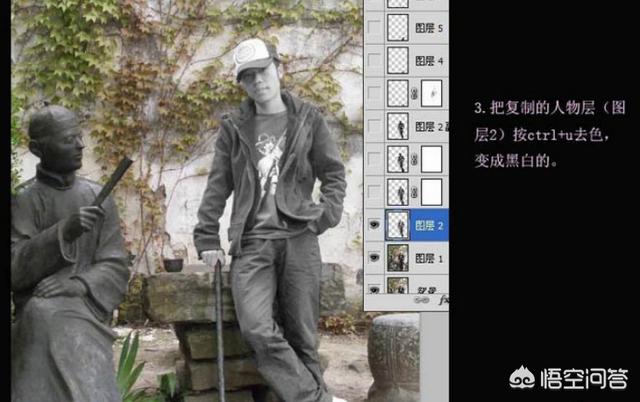 3、把复制的人物图层(图层2),按Ctrl + Shift + U 去色,变成黑白的。
