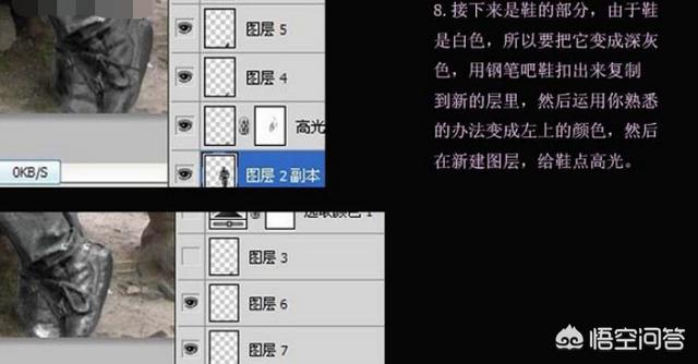 8、接下来是鞋的部分,由于鞋是白色的,所以要把它变成深灰色,用钢笔把鞋子抠出来,复制到新的图层,然后运用你熟悉的方法百年城左上的颜色,然后再新建图层,给鞋子点上高光