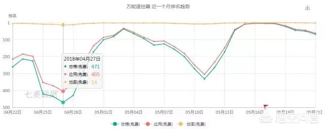 说到“互联互通”,什么设备可以具备交互能力?容易想到的是 PC 和手机,可以通过终端控制完成多样家电设备的运行,方便省时。尤其手机,小巧便携,操作空间更灵活,为此诸如万能遥控器一类的 App 慢慢出现在人们视野当中。近期,根据七麦研究院的观察,原本表现平平的万能遥控器突然火了起来,从五月初开始飙升至 App Store 效率类榜单前 5 名,15 日之后更是身居榜首数天,17 日单天下载量破 29 万,气势相当饱满。