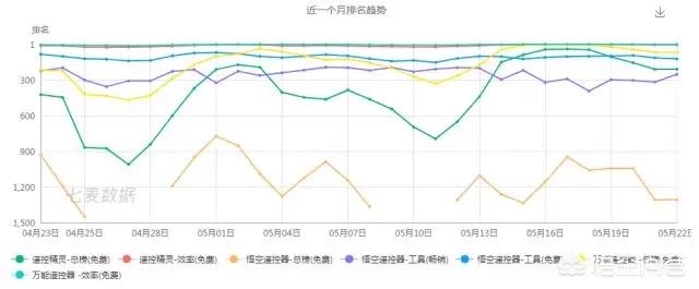除了万能遥控器,遥控精灵、悟空遥控器在近期的榜单成绩也都不错,都或大或小向上波动的迹象。
