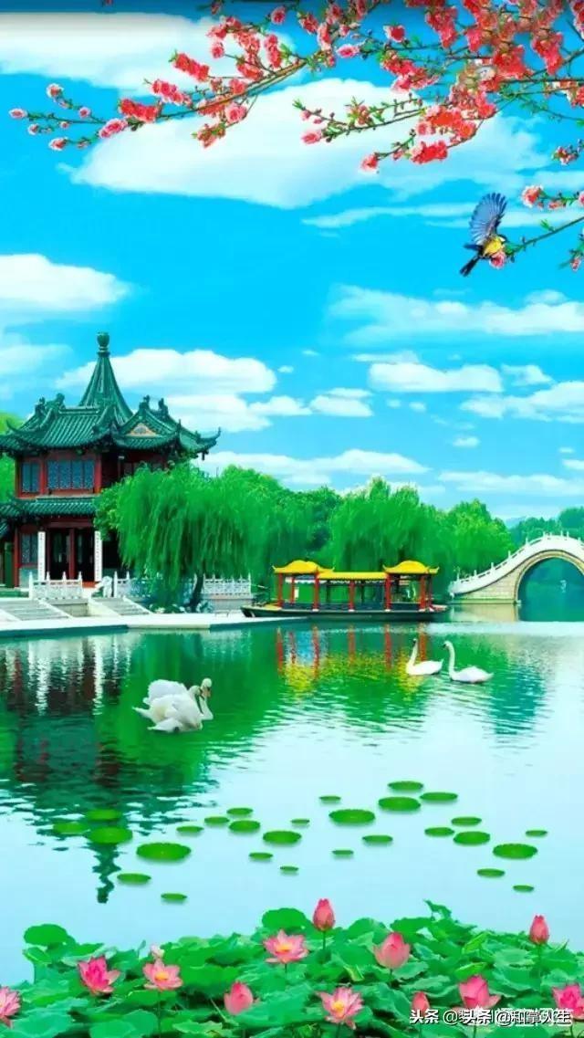 青松挺拔志凌云,山峰耸立燕飞行。绿柳迎风丝飘舞,水面泛舟笛声鸣。
