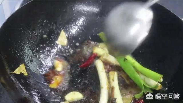 在刚刚省下的油中加入两勺白糖,小火炒出焦糖色之后加入葱姜蒜、八角、香叶、桂皮、干辣椒。