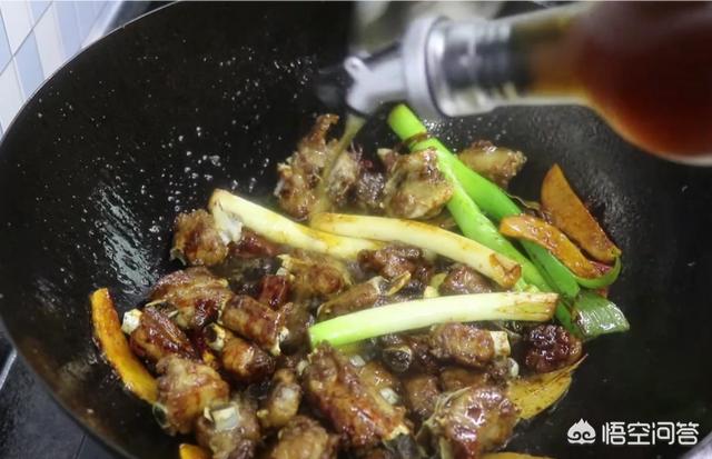 在加入排骨,放入料酒,少许的盐和老抽,放入水。提别提醒,还要加入一勺白糖,刚刚加的糖已经没有甜味了。