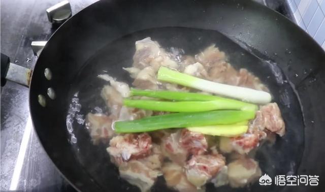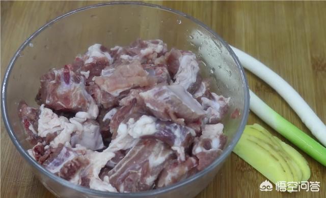 锅里放入冷水,先给排骨焯一下水,这里要注意的是一开始要放冷水加热。在焯水时,加入一点姜和葱、料酒去一下腥。水烧开后,把浮沫撇掉,把排骨捞出备用。