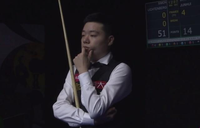 资格赛第9局,在最后6个彩球争夺战里,此时台面已经形成延分状态,54:27,丁俊晖领先,一只脚实际上已经踏进了正赛,但是,西蒙一个简单的黄球做成斯诺克,丁俊晖竟然一库没有解到球。这样的低级错误真的不应该发生在像丁俊晖这样的大师级别的身上。
