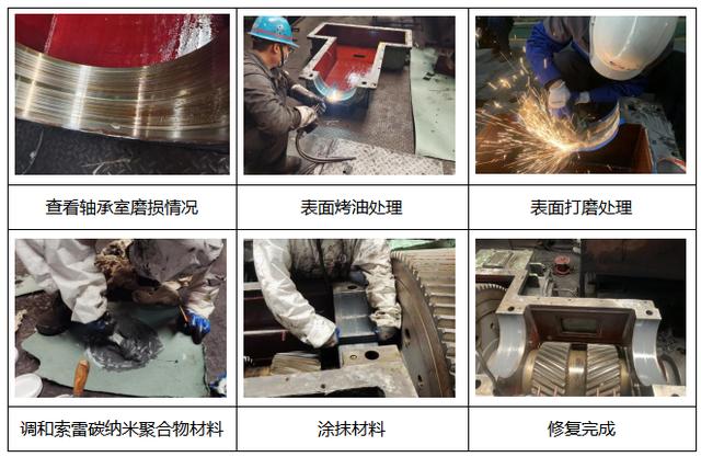 采用索雷碳纳米聚合物材料修复轴承室磨损问题,是目前较为成熟的和性价比较高的一种修复方案。该材料具有良好的粘结性能,并通过表面烤油、打磨、清洗等处理,增加材料的粘结力,以确保材料不会脱落。可以现场在线修复,并且在线修复过程中能够很好地保护设备本体不受损伤;此外,该技术不需要对设备进行大量的拆卸,仅对修复部位拆卸即可,大大缩短了企业停机停产时间,降低了企业的经济损失。