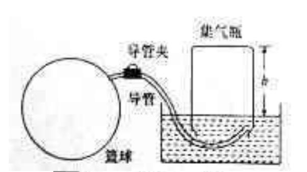 借鉴化学“排水集气法”,要用到一个集气瓶,并且先测出集气瓶的内部横截面积S;给篮球打足气,用电子天平测出篮球的质量m1;集气瓶装满水,倒立在水槽中,带夹导管一端连接篮球气嘴,一端插入集气瓶中;松开导管夹,对集气瓶放气,在篮球体积没有明显减小时,停止放气;用天平测出放气后篮球的质量m2;调整集气瓶的高度,使瓶内外水面相平,测出瓶中空气柱的高度h。