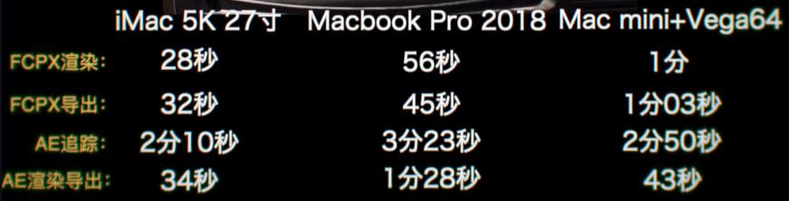 在FCPX导出和AE渲染这2个经典场景中 iMac 2019 5K最低配 秒杀 Mac mini + Vega 64,我们看一下实际评测对比情况