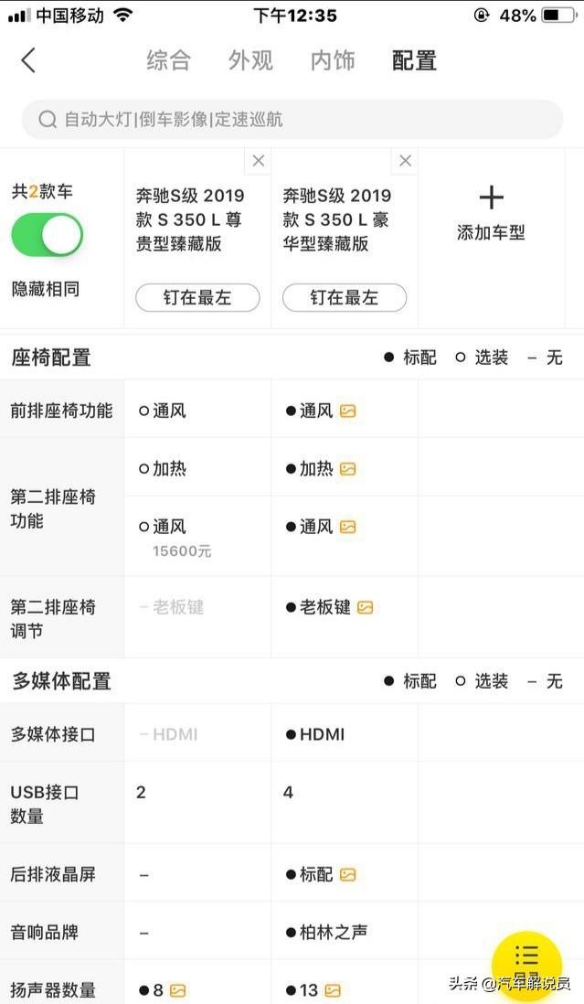 知道了不同点后再来算改装的帐就比较清楚了,首先,改装项目清单里面柏林之声、360全景、后排娱乐是在S350L豪华版里面就已经标配了,且豪华版座椅还带有通风加热功能,综合计算,这部分的改装费用和两款车型的差价差不多,直接购买豪华版可以省去这些改装费用,还能省时间折腾。我们看看清单里面的各个改装项目,都有哪些功能和效果。