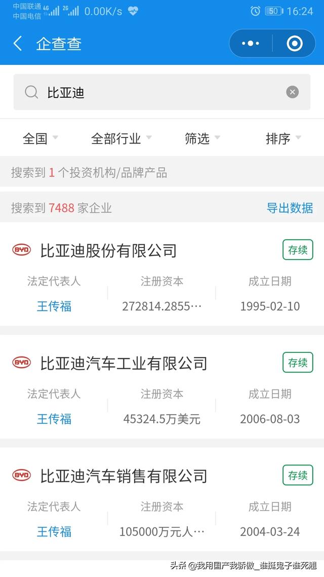 看图吧,微信小程序,企查查,搜索“比亚迪”,刷新你对比亚迪的三观!这个查询界面不能截长图,不然会消耗我不少流量的。