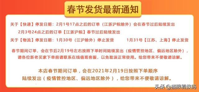 春节快递不打烊?其实每年都会提这个口号,但真正能够做到春节正常派送的快递只有极个别的一两家,大部分快递仍然是正常放假的。而且就算快递不放假,卖东西的商家也要放假。比如我前两天在某猫买了个箱子,等了两天还没见掌柜发货,一问才知道他们在2月1日就已经停发江浙沪之外的快递了,2月3日之后店家也放假了。后来接连问了几家店铺,也基本上都已经放假不发货了,只好打消在网上买东西的念头。