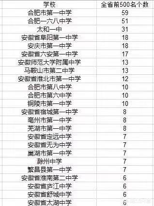 安徽省前500理科前两位分别是合肥一中59人,合肥一六八中51人,这两校优势明显,第三是太和一中31人,自成一档;文科前500名,合肥一六八中65人遥遥领先,其次是阜阳一中31人,合肥一中26人,第四是太和中学25人。