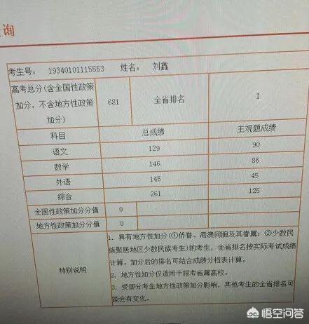 2019安徽省高考文科第一名来自合肥一六八中学:刘鑫,总分681分。