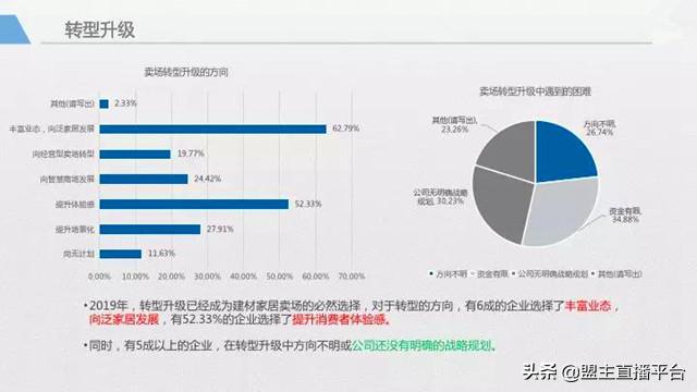 目前,转型升级已经成为建材家居卖场的必然选择,对于转型的方向,有6成的企业选择了丰富业态,向泛家居发展,有52.33%的企业选择了提升消费者体验感。同时,有5成以上的企业,在转型升级中方向不明或公司还没有明确的战略规划。