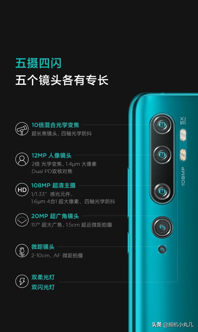 小米CC9Pro这是全球首款一亿像素的手机,后置五摄,除了主摄还有人像,广角,长焦,微距相机。从硬件来说,小米cc9pro后置相机配置要更高,不过处理器骁龙730G带一亿像素有些吃力,拍照时间有些长。
