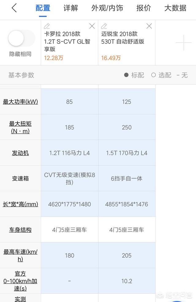 动力系统方面,迈锐宝提供1.5T涡轮增压发动机匹配6挡手自一体变速箱,最大马力170,卡罗拉提供1.2T涡轮增压配CVT无级变速箱,最大马力116,性能上迈锐宝也更胜一筹。同价位配置上迈锐宝也稍微给力一点,后悬架是独立悬架,还多出天窗和自动空调等,所以性价比而言,建议考虑迈锐宝,祝顺利。