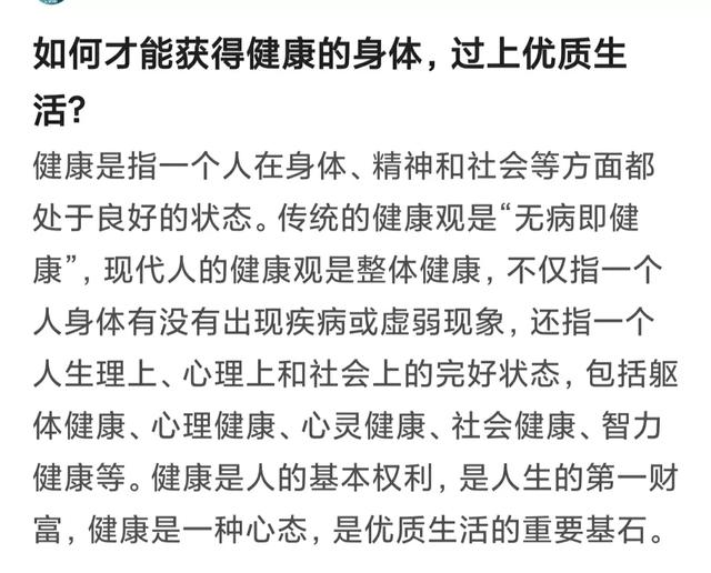 你说的完全正确,在物质生活贫乏经济困扰的情况下,人们躯体无病即为健康。现在经济水平达到了一定的高度,物质生活也很富裕,人们对健康的要求不仅是躯体(生理)无病而且心理也无病,还要有良好适应社会状态(生存环境)能力。所以,要想获得健康身体,过上优质生活我看还需要养成良好的生活习惯,不断提高自己的健康素养。就是要学会合理膳食,尽量有比例的、全面的根据自已的身体状况食入各种营养素。就是要学会心理调节,学点心理知识,学会调节心理,及时纠正自己的心理偏差,尽量使自己在愉悦的环境下,快乐的生活。就是要学会什么样的运动是适当运动,怎样才能培养自己锻炼好身体做好适当运动。就是要学会怎样才能改变自己的不良生活习惯,养成良好的有利于自己身体健康的好行为。
