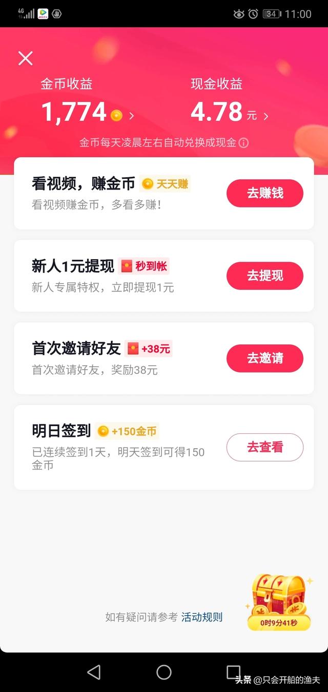 填写红包邀请码:CQEUTYQ6就可以领取红包奖励,可以直接提现到支付宝和微信里。 (永久有效,苹果安卓可用) 这个极速版里有签到,开宝箱,阅读,看视频等等的任务攻略,是目前接触金币到兑换现金靠谱的软件!
