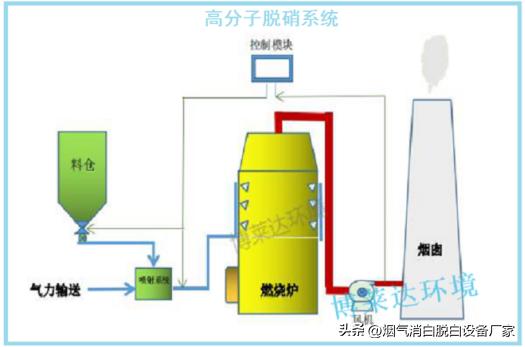 PNCR工作机理为:在600-900℃之间,高分子干粉脱硝剂被喷入炉内,在高温下,脱硝剂被激活气化,迅速和烟气中的NOx发生反应,生成N2 、H2O或少量的 CO2,进而达到脱除NOx目的,实现氮氧化物达标排放的要求。