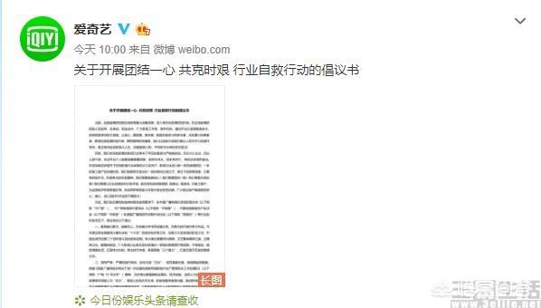 日前有消息显示,腾讯视频、爱奇艺、优酷三家视频网站,以及正午阳光、华策影视、柠萌影业、慈文传媒、耀客传媒、新丽六家影视制作公司联合发布了《关于开展团结一心 共克时艰 行业自救行动的倡议书》。