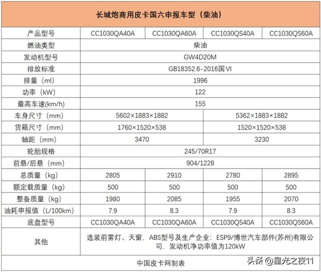 乘用皮卡车身尺寸为5410×1934×1886mm,货箱尺寸为1520×1520×538mm,过审的两款车型在总质量和整备质量上存在不同,而且长城炮系列皮卡正式亮相,全时四驱+三把差速锁,媲美福特猛禽。