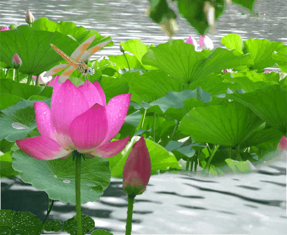 尖尖小菡蜻蜓舞,灿灿落霞鹜孤飞。