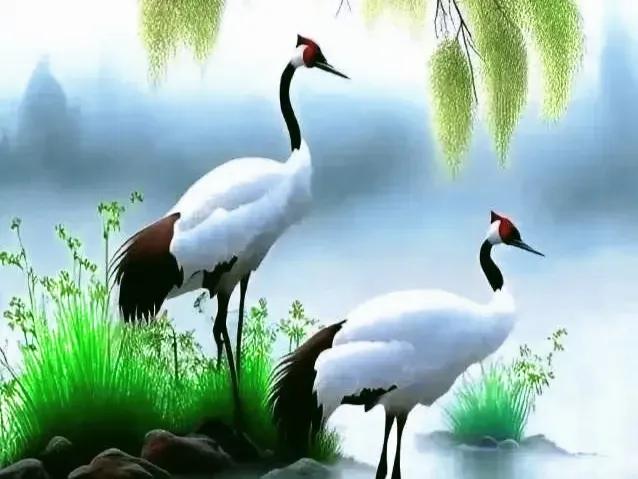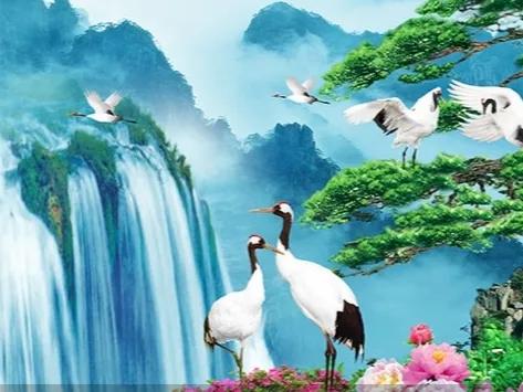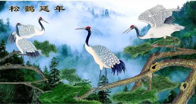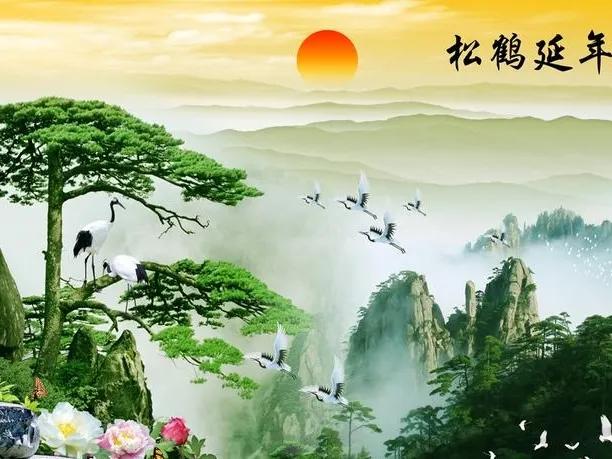 下联:山高柏翠鹤逍遥。