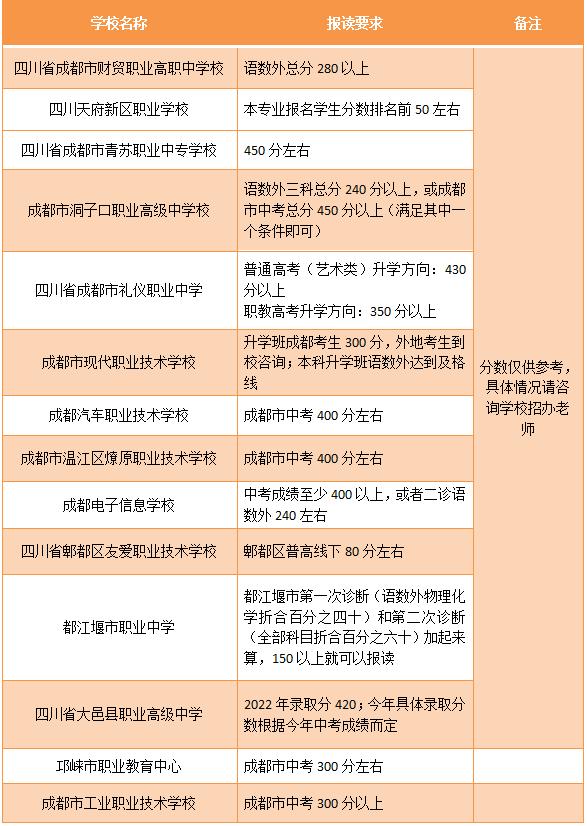 现在基本上每个中职都有升学班,我知道的有成都市财贸职业高级中学校、成都铁路卫生学校、四川省商务学校、成都职业技术学校、成都市现代职业技术学校、成都华商理工职业学校、崇州职教、邛崃职教,分数要求都不一样,基本上都要430以上吧,而且有些会看语数外三科的成绩,成绩好的话选几所具体去问一下学校吧。