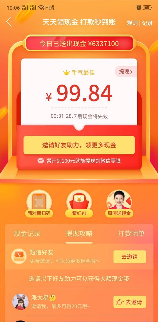 今年春节的时候我有一个哥们儿拉我助力。后来他提了100元现金出来。去年十一的时候,我在14个朋友的助力下,其中有一个是新人,专门为了我下载了APP,我提了50块钱。