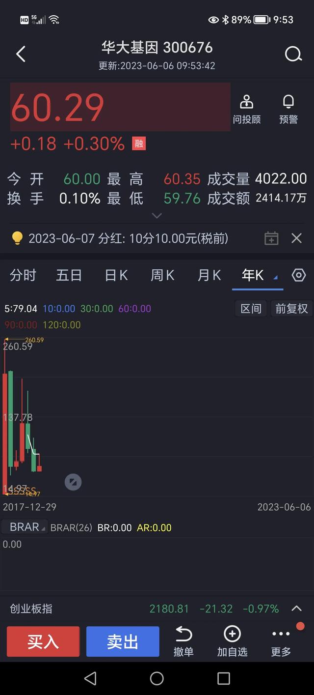 2017年,13.64元中签华大基因,涨到100元时卖了。卖后,该股开始下跌,当时那个高兴啊,庆幸自己卖了个高点。可是,过一段时间,该股开始上涨,自己犹豫了几次想进场,但都没有敢出手。该股越涨越疯,我的胆子也越来越小,眼瞅着涨到260多元。这个悔后的啊,甭提了![捂脸][捂脸][捂脸]