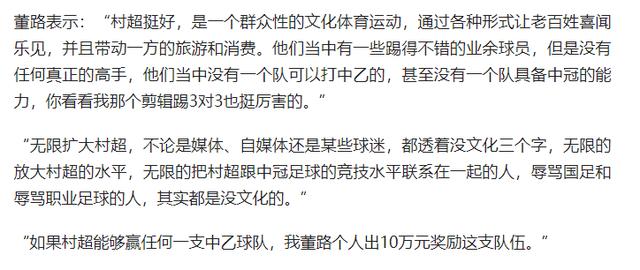 然而,董路对于一些媒体、自媒体和球迷过度夸大贵州村超联赛水平的行为表示不满。他认为这些人的行为透露出一种缺乏文化素养的态度,无限夸大贵州村超联赛的水平,并将其与职业足球的竞技水平进行对比,以此辱骂国家队和职业足球。他明确表示,这些人的行为是没有文化的表现。