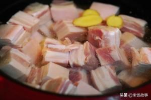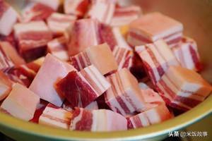 1.五花肉微冻的时候比较好切,这时候切出来的也漂亮,对颜值有要求的宝儿们可以在微冻时候切成大块哈,一定要是大块,吃起来特别过瘾,外面餐馆也多是大块。然后凉水浸泡2-3个小时,把血水泡出来,清洗干净备用。