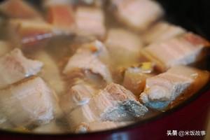 5.撇干净浮沫,一定要撇干净哈,把五花肉捞出剩下的清汤备用。