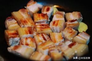 6.另起一平底锅,不用放油不用放油!先小火把五花肉码在锅里,然后用中小火把五花肉的每一个面都煎成金黄色。这一步一定要注意安全,不要被油崩到。