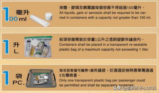 只要每个单独盛放在100ml以内的容器中,且所有物品应置于容积为1L,可重新封口的透明塑料袋中。