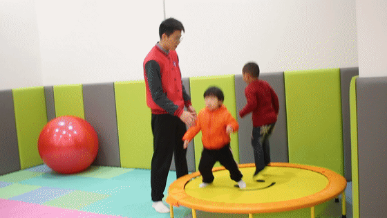 3.跳床游戏:可由父亲或母亲背着,在跳床上跳动,对固有平衡感及脑干组织的发展颇有帮助。